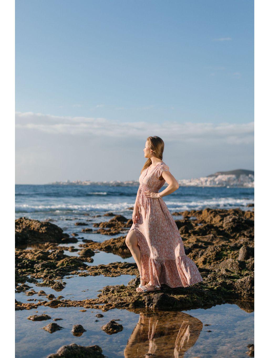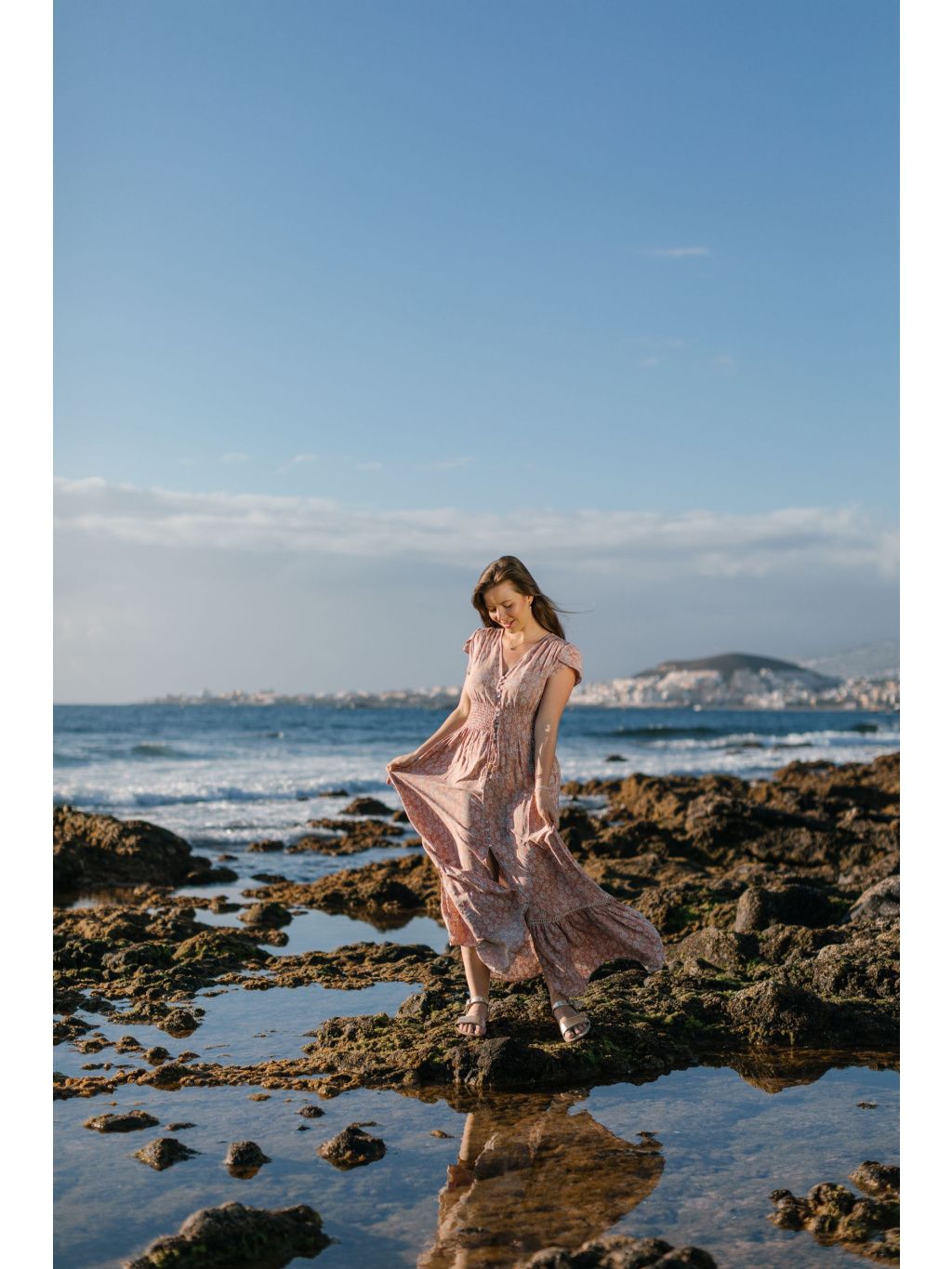 Šaty zaujmou ženským výstřihem do V, hravými motýlími rukávy a propínáním na perleťové knoflíčky. Pružný pas se přizpůsobí postavě a jemné šňůrky s bambulkami dodávají modelu stylový boho nádech.
