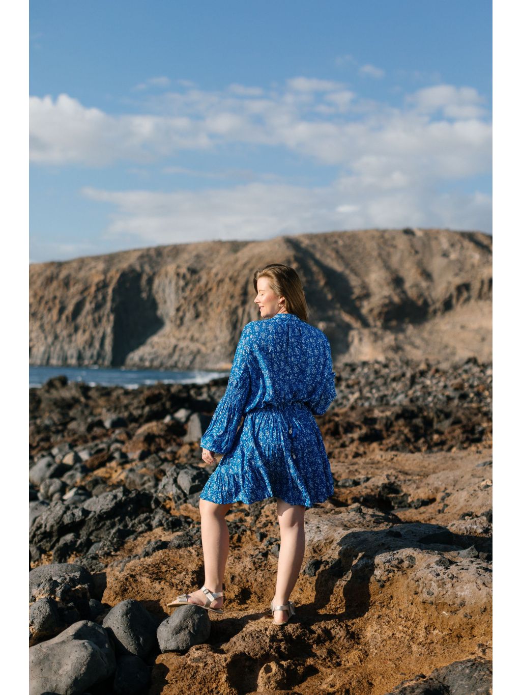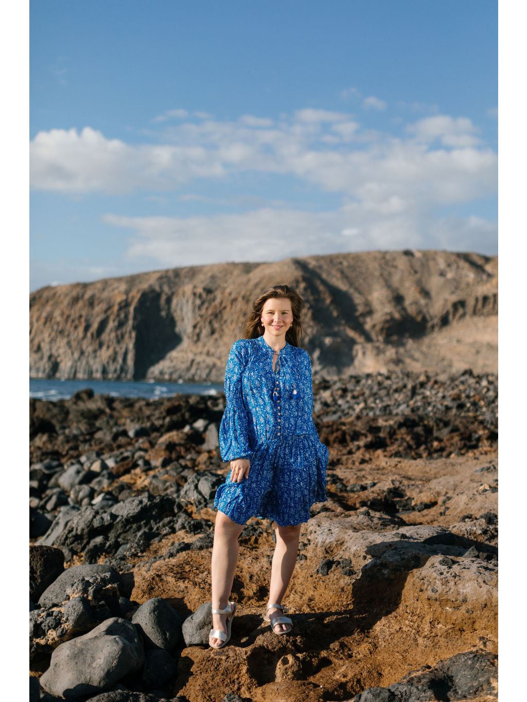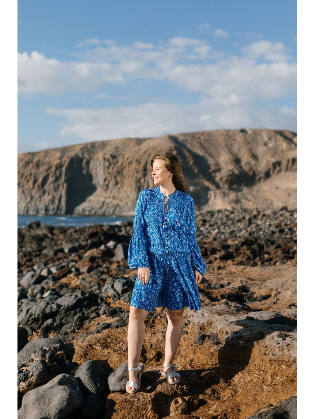 Tyto šaty jsou ušity ze 100% viskózy v sytě modrém odstínu s jemným bílým kvítím.