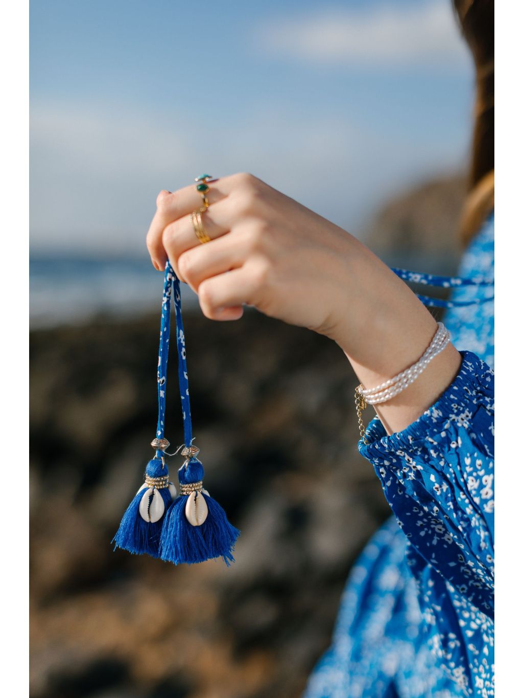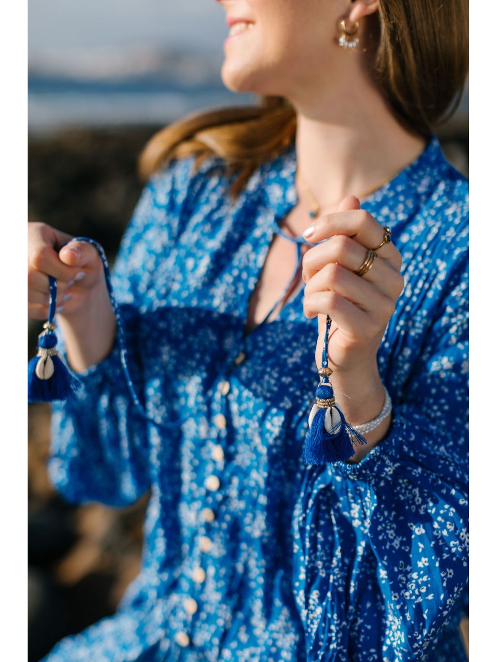 V pase jsou šaty staženy gumičkou a dozdobeny modrými šňůrkami s bambulkami a mušlemi.
