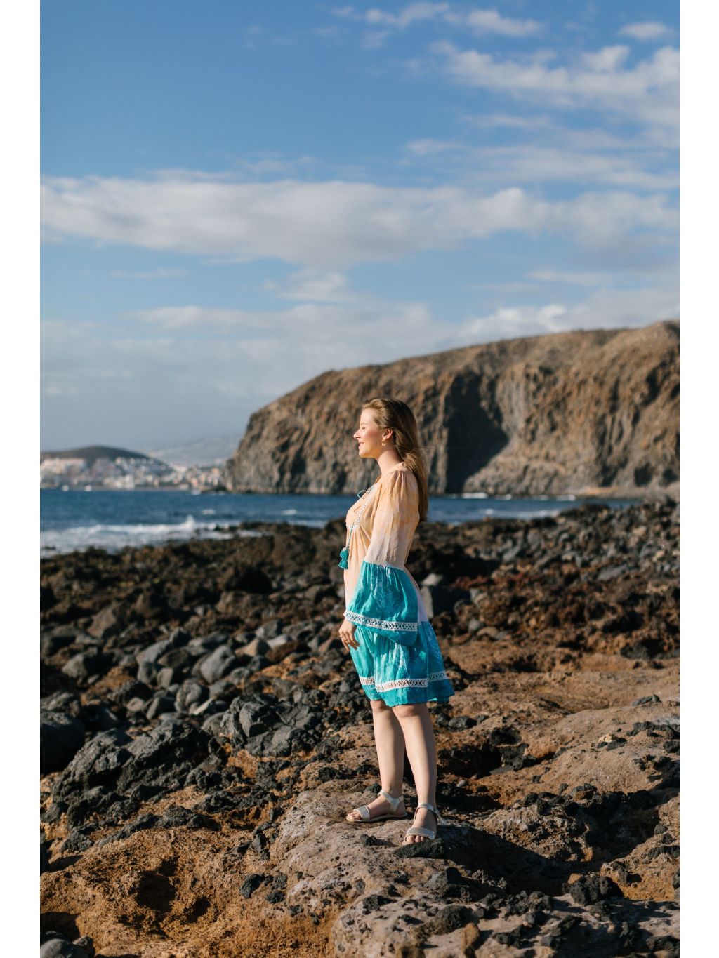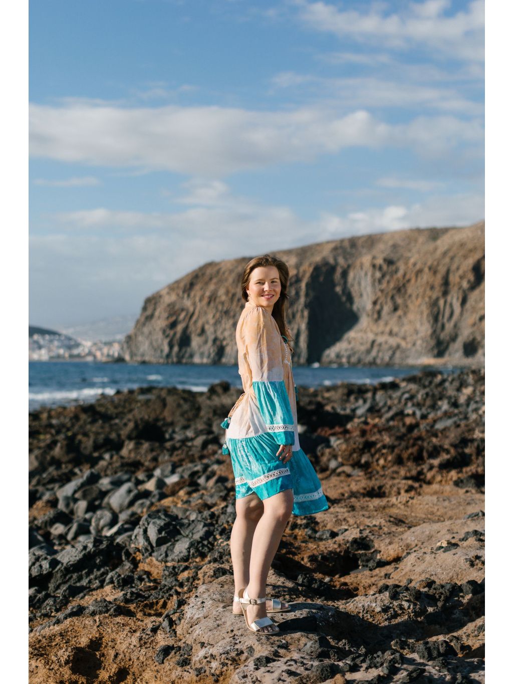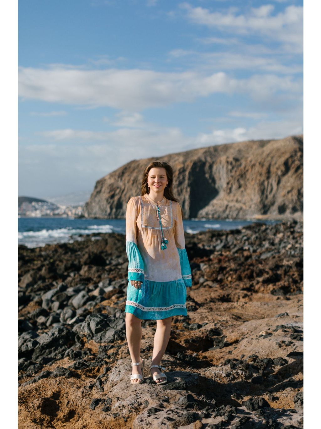Volný střih, členěná sukně s volány, výstřih do V se stojáčkem a tyrkysové šňůrky s bambulkami a mušlemi.