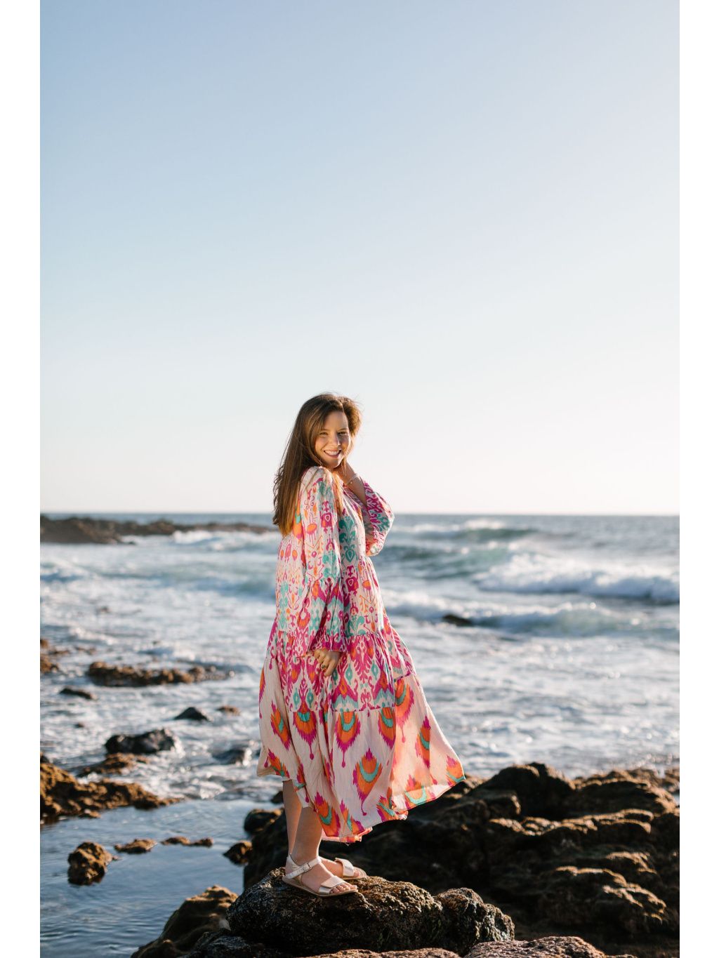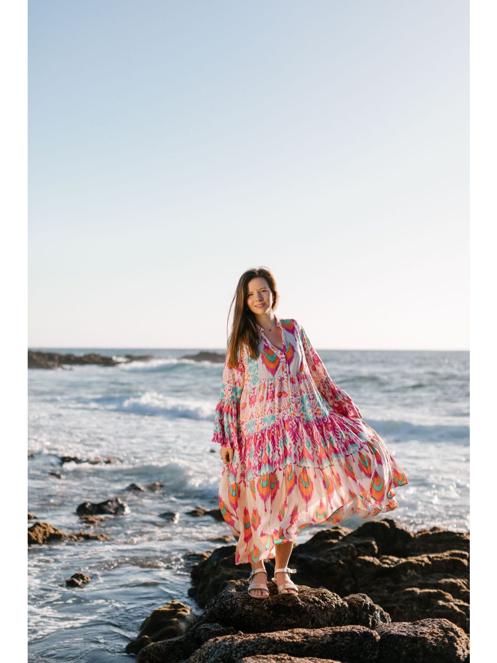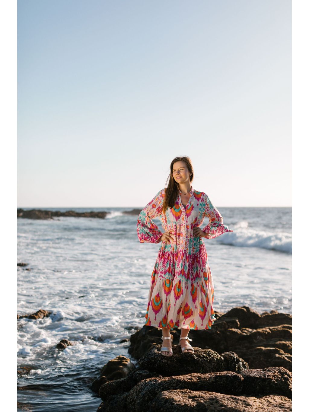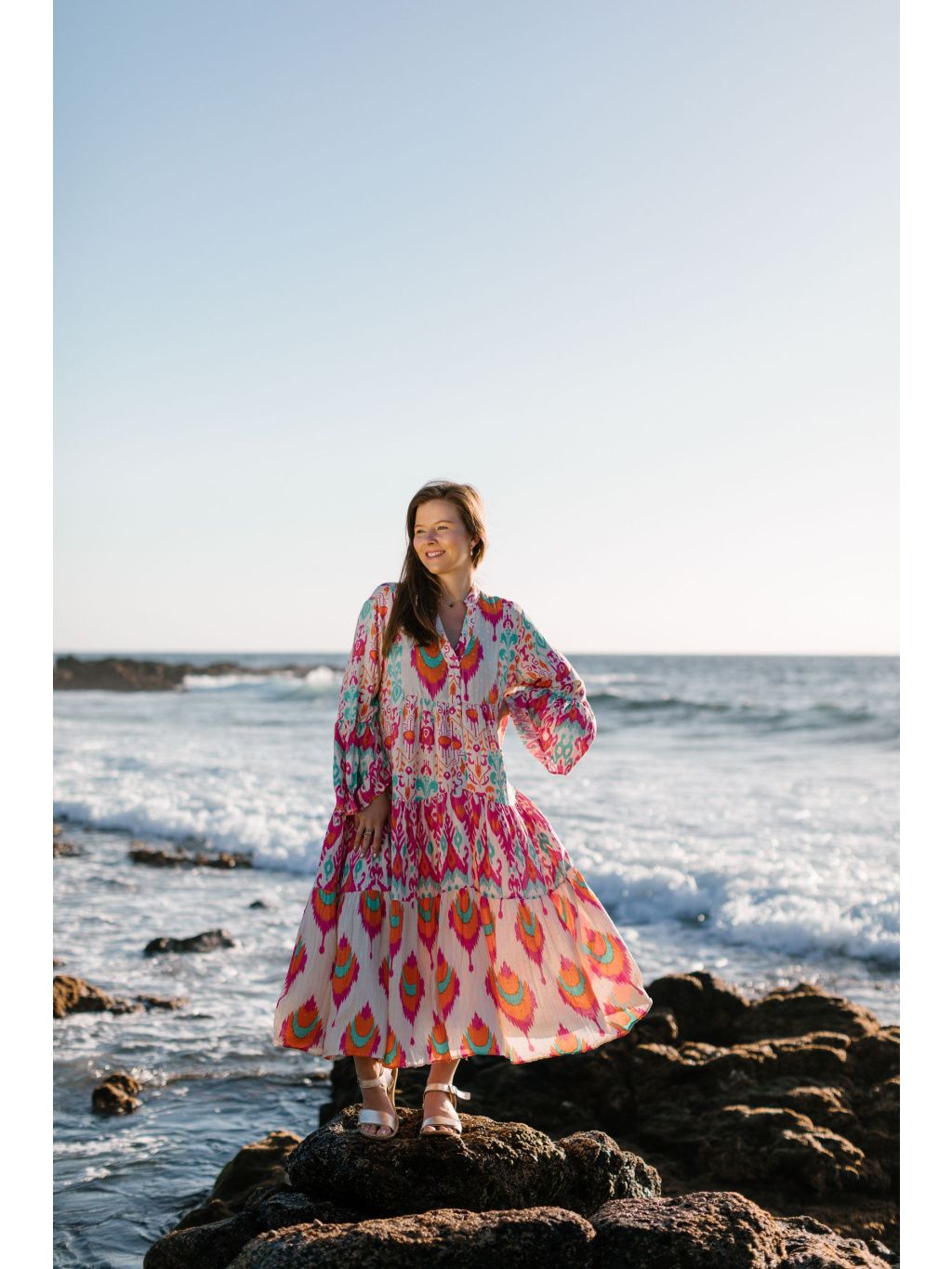 Výrazné midi šaty s barevným boho vzorem v růžové, oranžové a tyrkysové – odvaha v barvách, pohoda ve střihu. 🔥💜