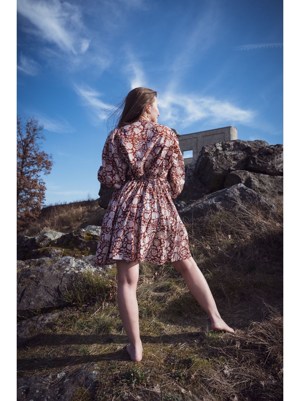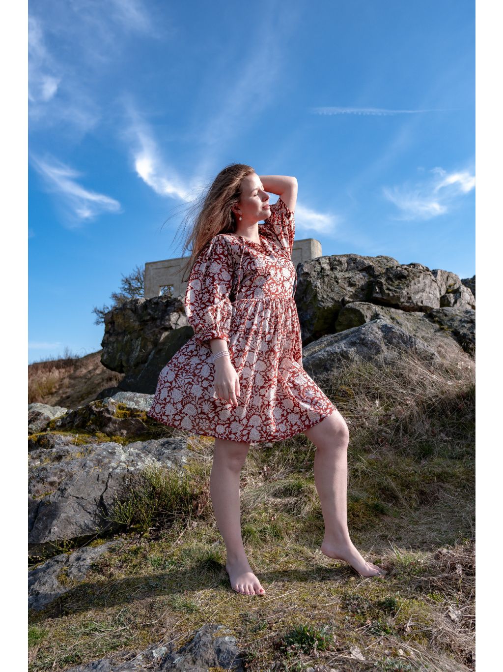 Šaty střihu Artemis z kolekce Bohyním v cihlové barvě s jemným rostlinným motivem jsou velice vzdušné, ideální na letní horké dny.