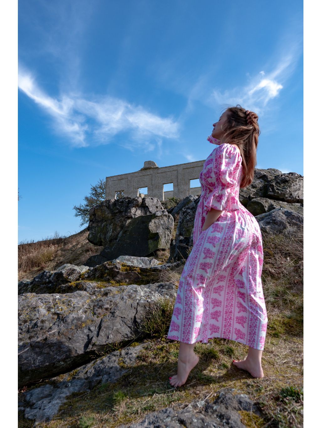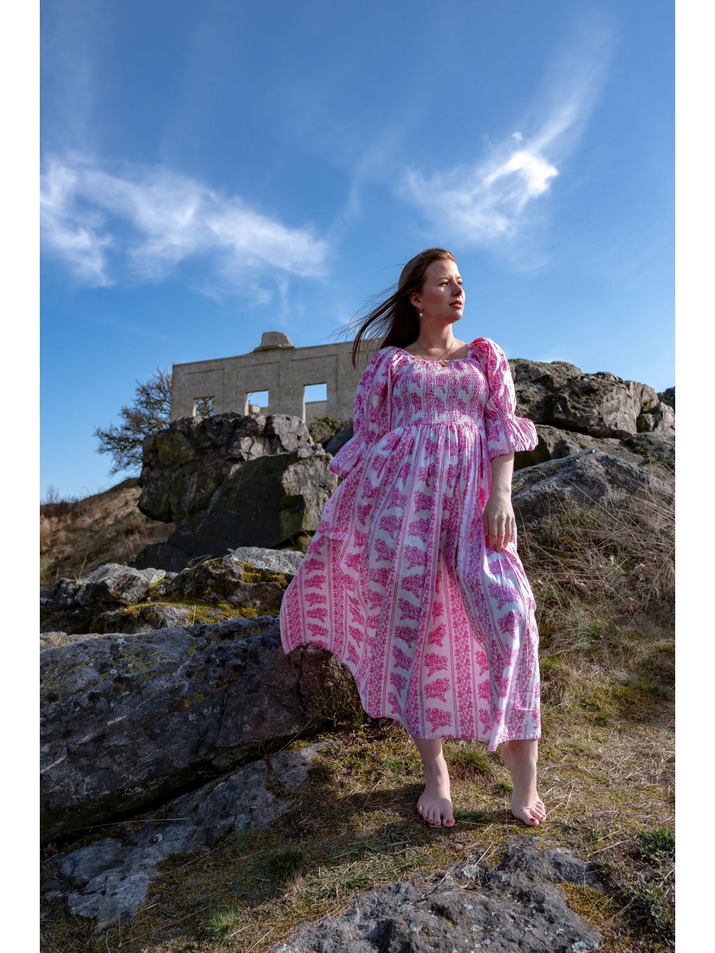 Romantické midi šaty s žabičkovaným vrchem ze 100% bavlny a květinovými vzory. Vyrobeno v Indii pod značkou Bohyní.🌸✨