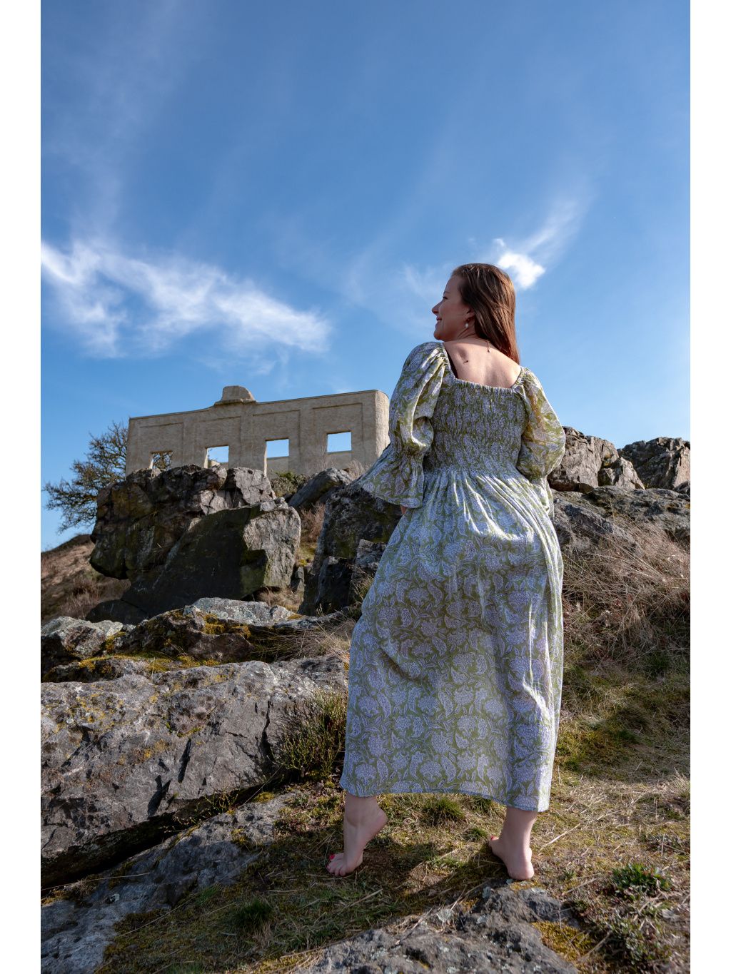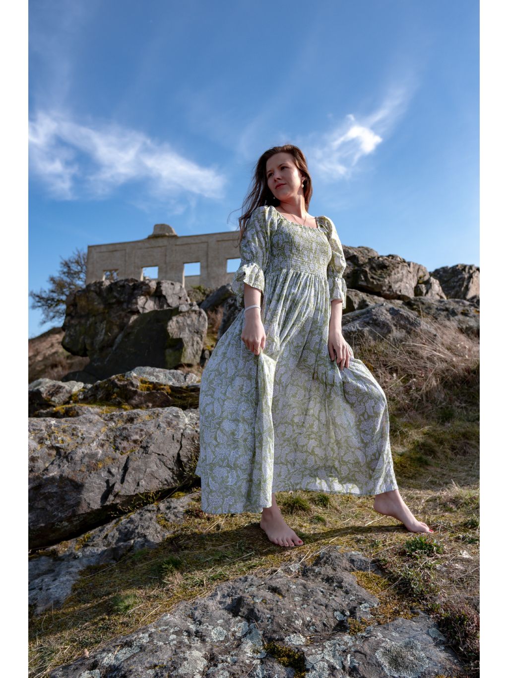 Romantické midi šaty s žabičkovaným vrchem ze 100% bavlny a květinovými vzory. Vyrobeno v Indii pod značkou Bohyní.🌸✨