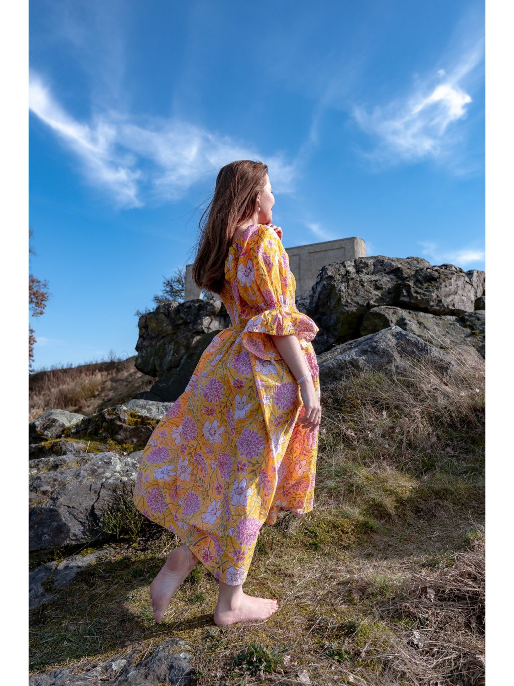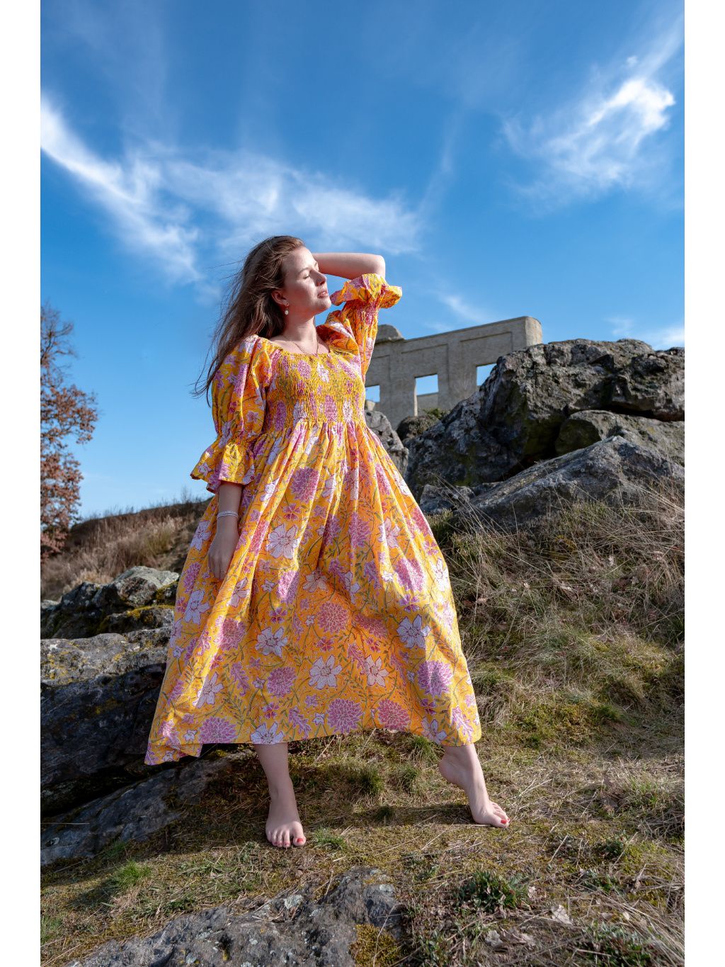 Romantické midi šaty s žabičkovaným vrchem ze 100% bavlny a květinovými vzory. Vyrobeno v Indii pod značkou Bohyní.🌸✨