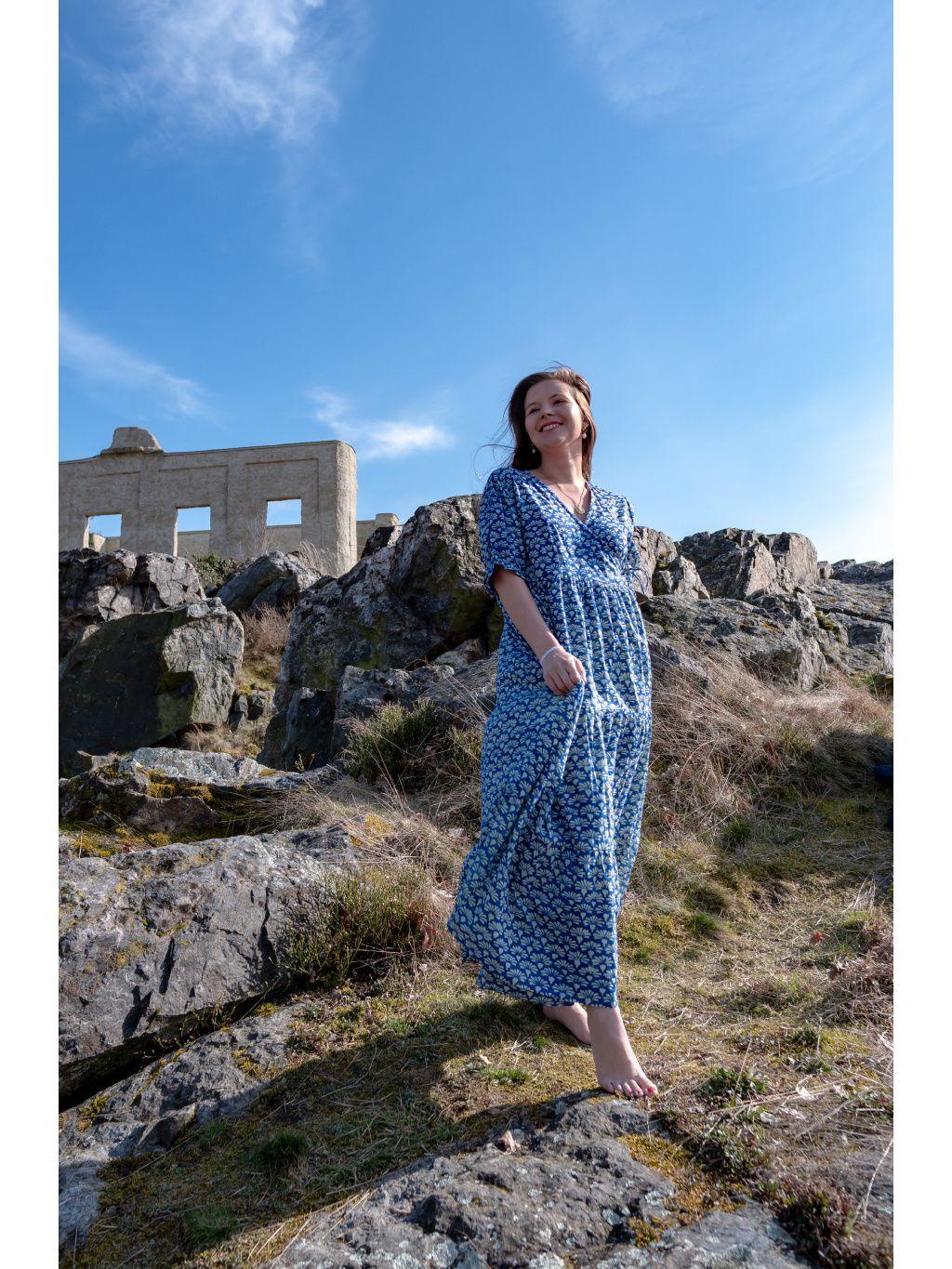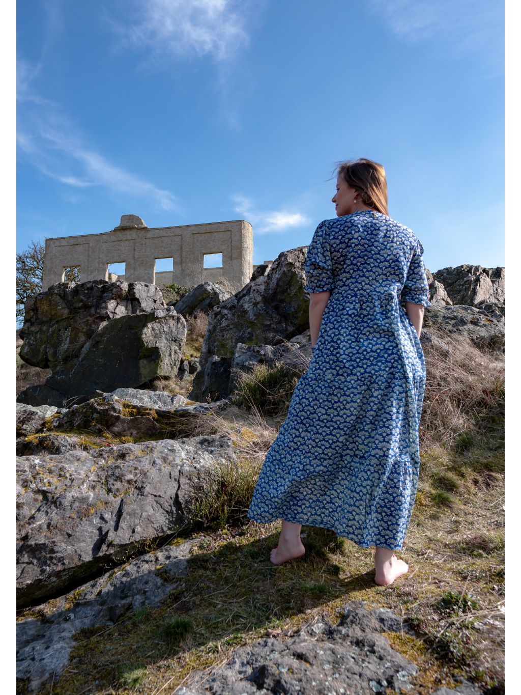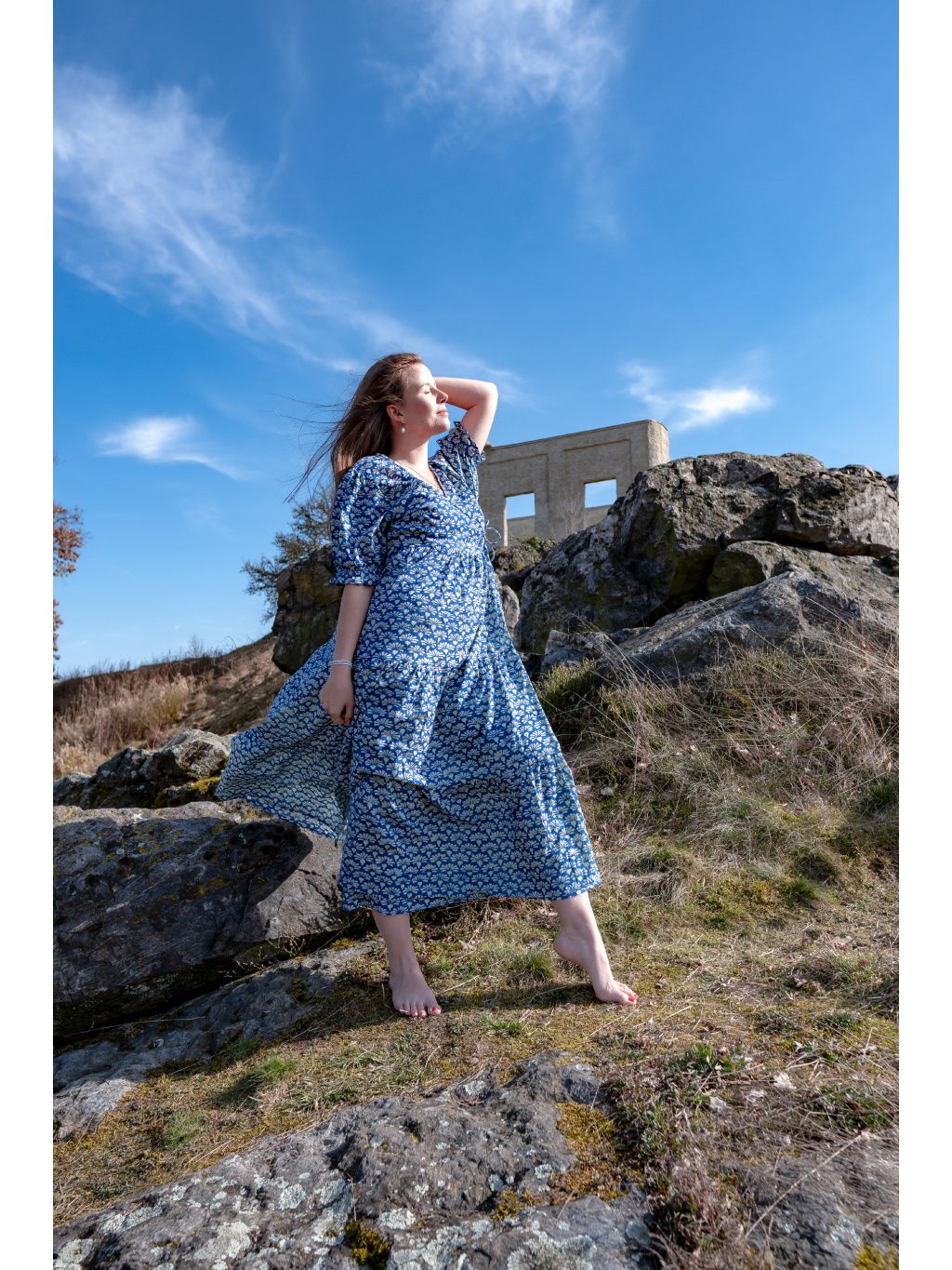 Zavinovací šaty ve střihu Vesna z kolekce Bohyním v tmavě modré barvě se symetrickými bílými ornamenty působí neuvěřitelně žensky a svěže. Dominantou střihu jsou balónové rukávy a dlouhá splývavá sukně.