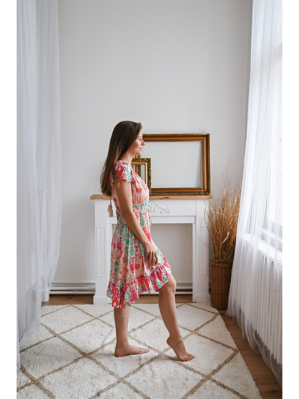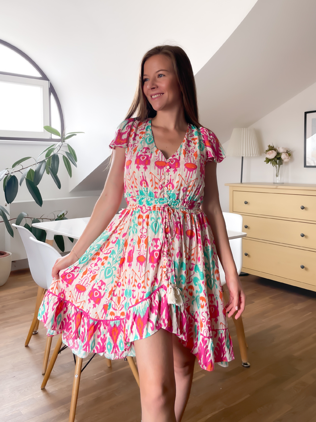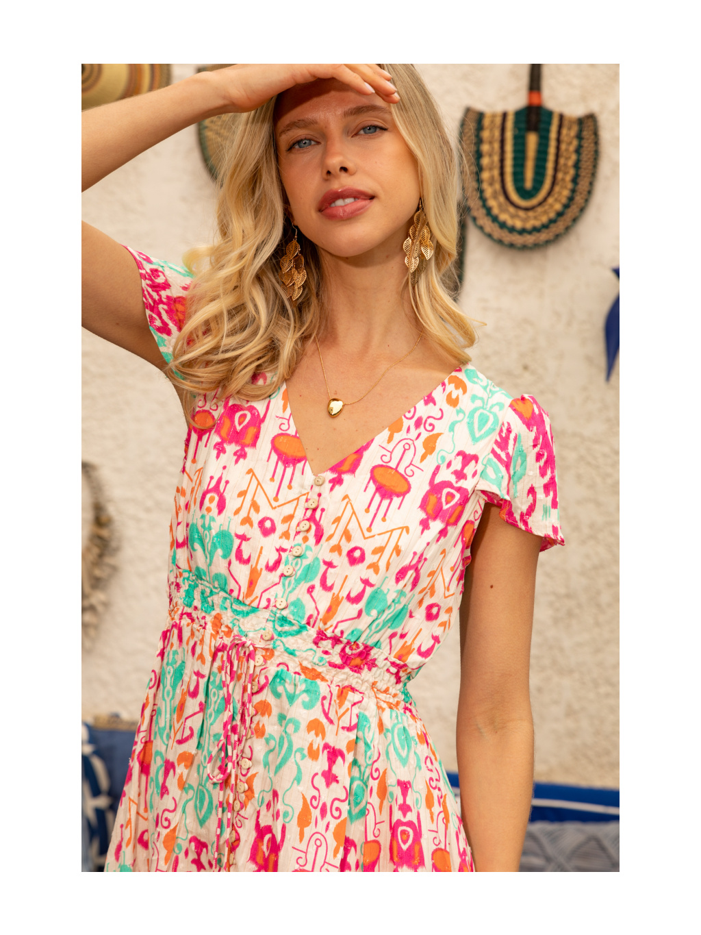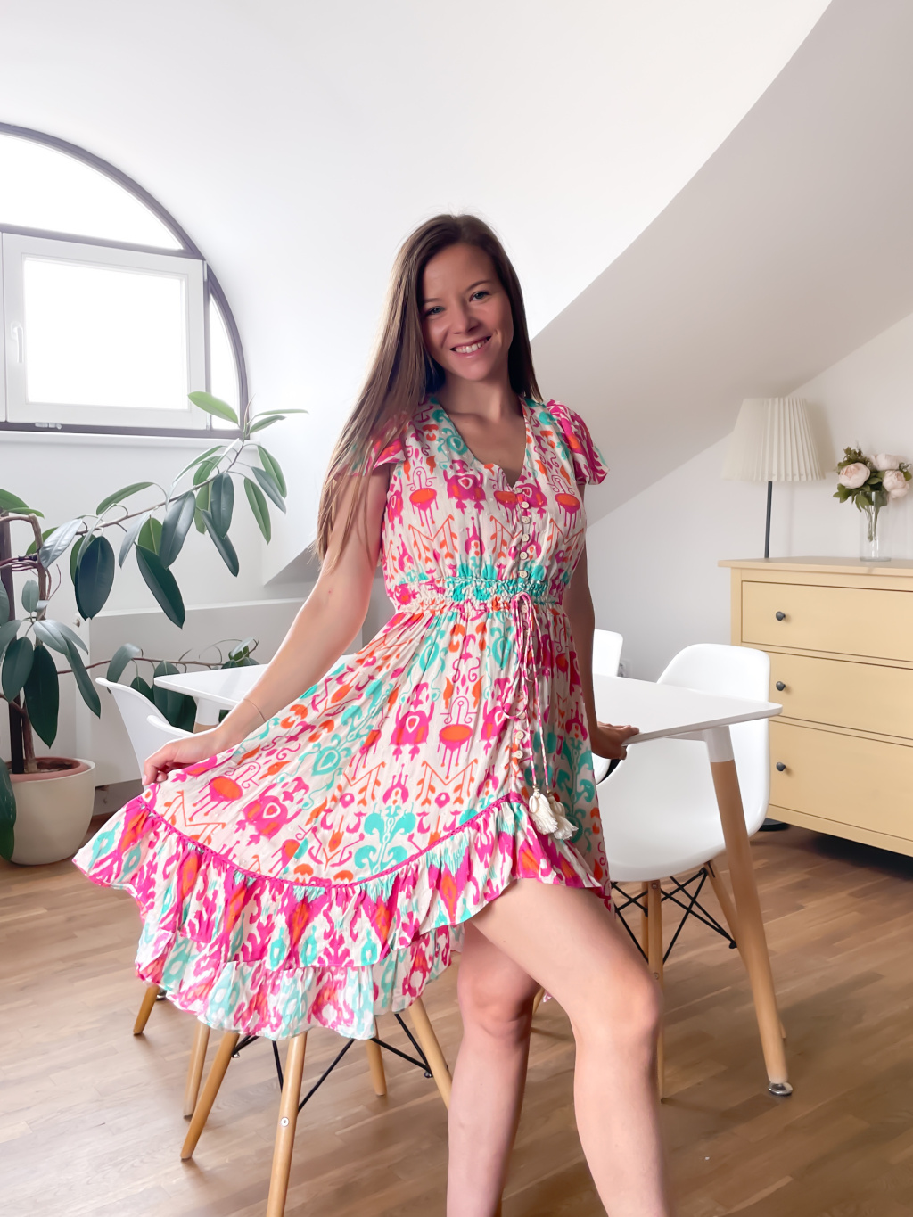 Barevné midi šaty s žabičkovaným vrškem z lehoučké 100% viskózy. Od australské značky Avamia – pro dny, kdy chceš zářit. 💃