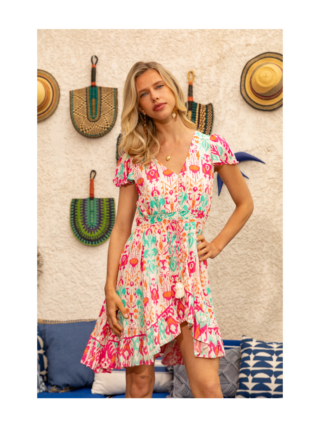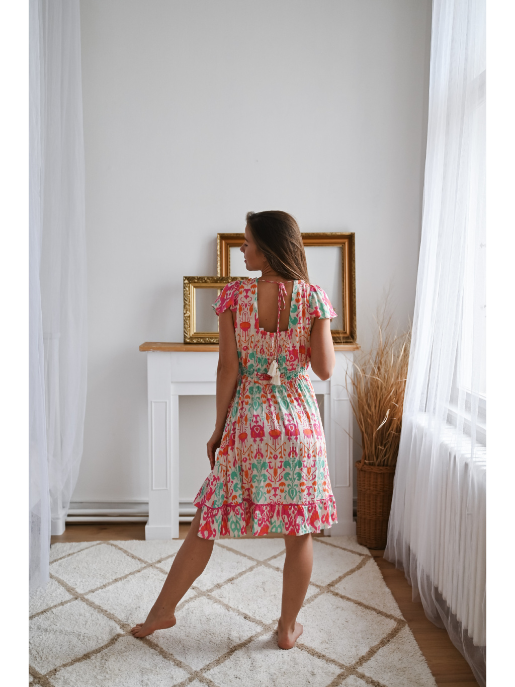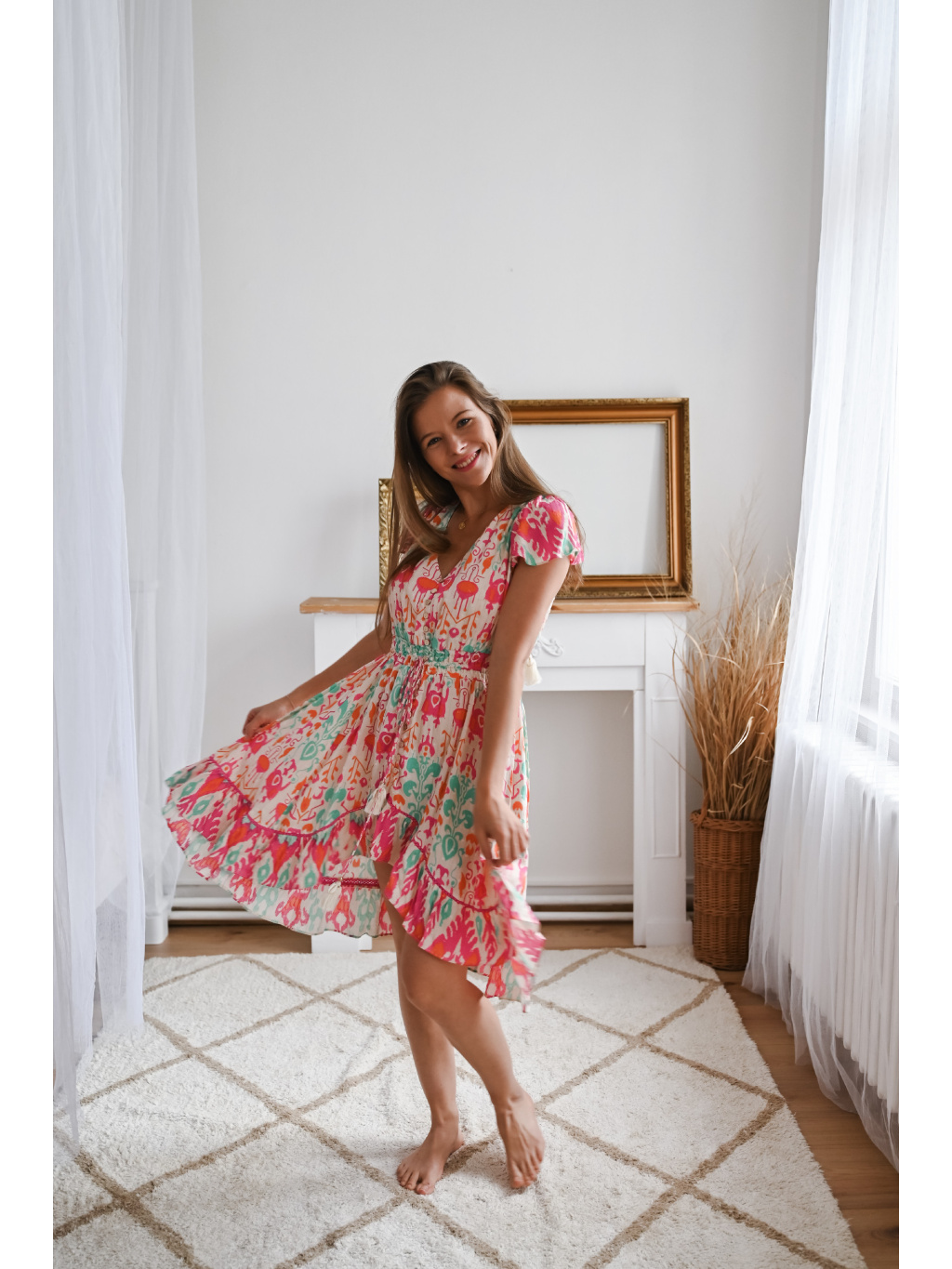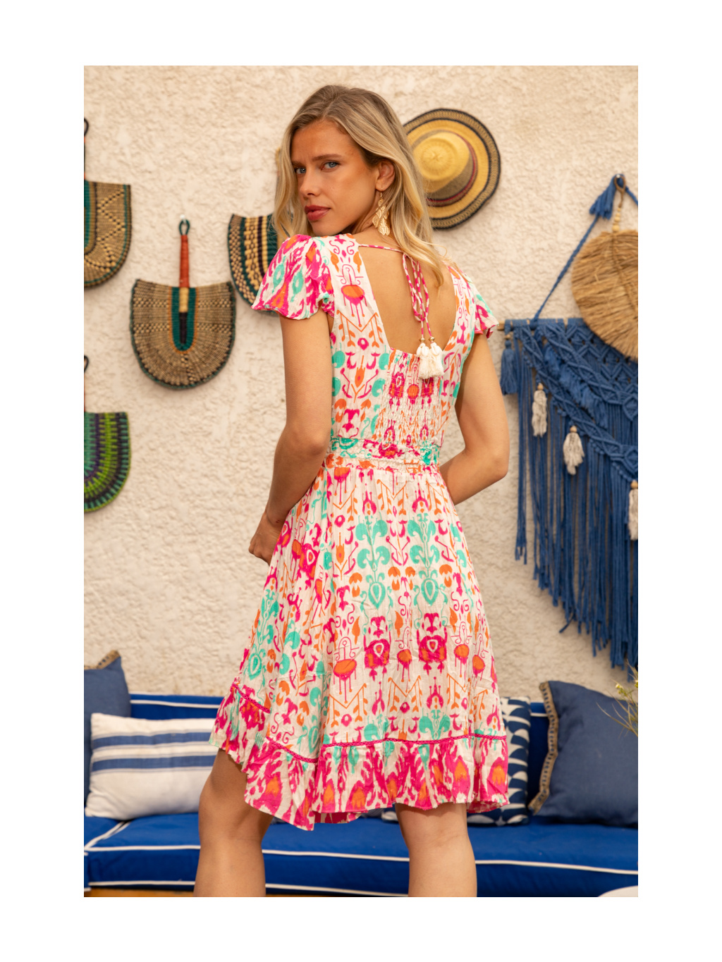 Barevné midi šaty s žabičkovaným vrškem z lehoučké 100% viskózy. Od australské značky Avamia – pro dny, kdy chceš zářit. 💃