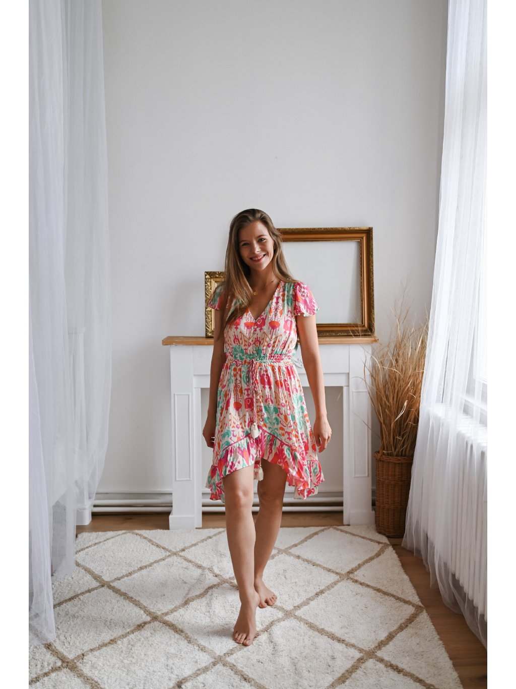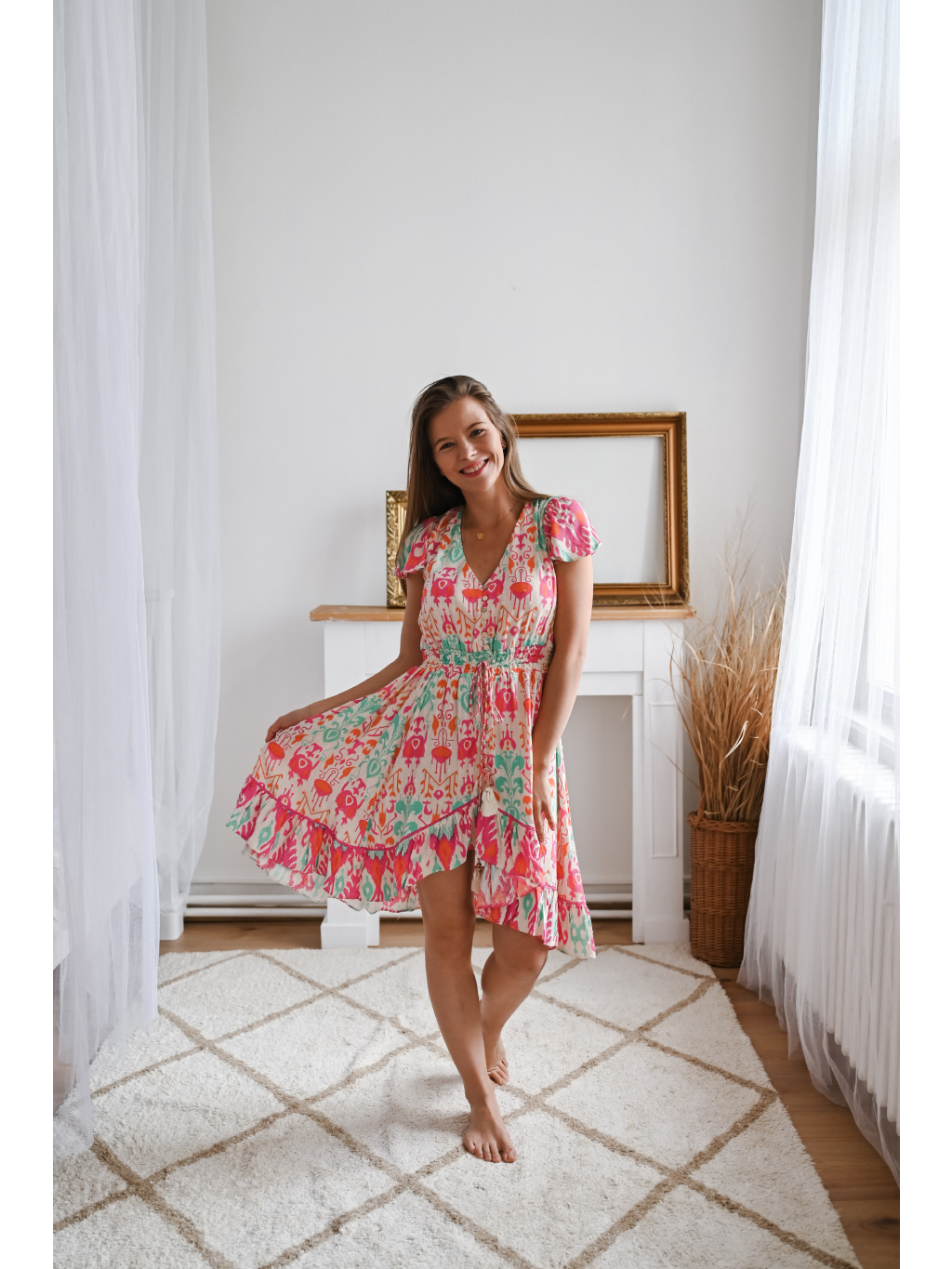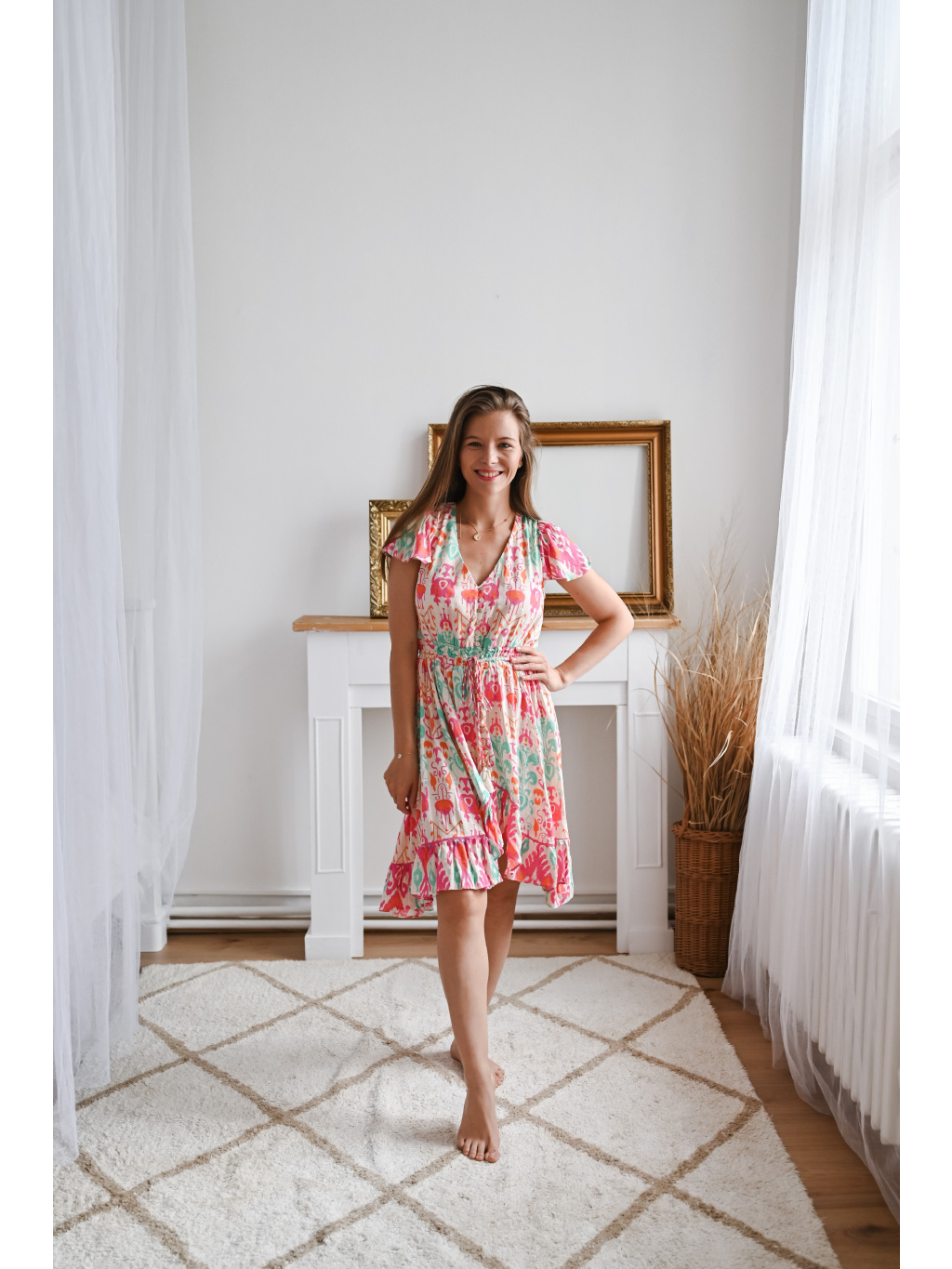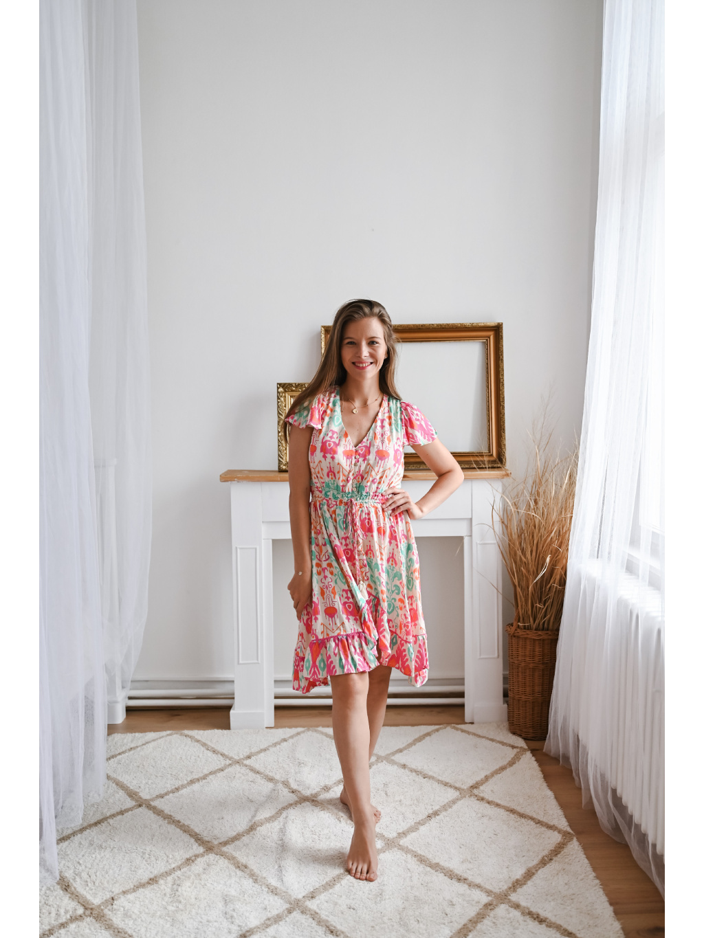 Barevné midi šaty s žabičkovaným vrškem z lehoučké 100% viskózy. Od australské značky Avamia – pro dny, kdy chceš zářit. 💃