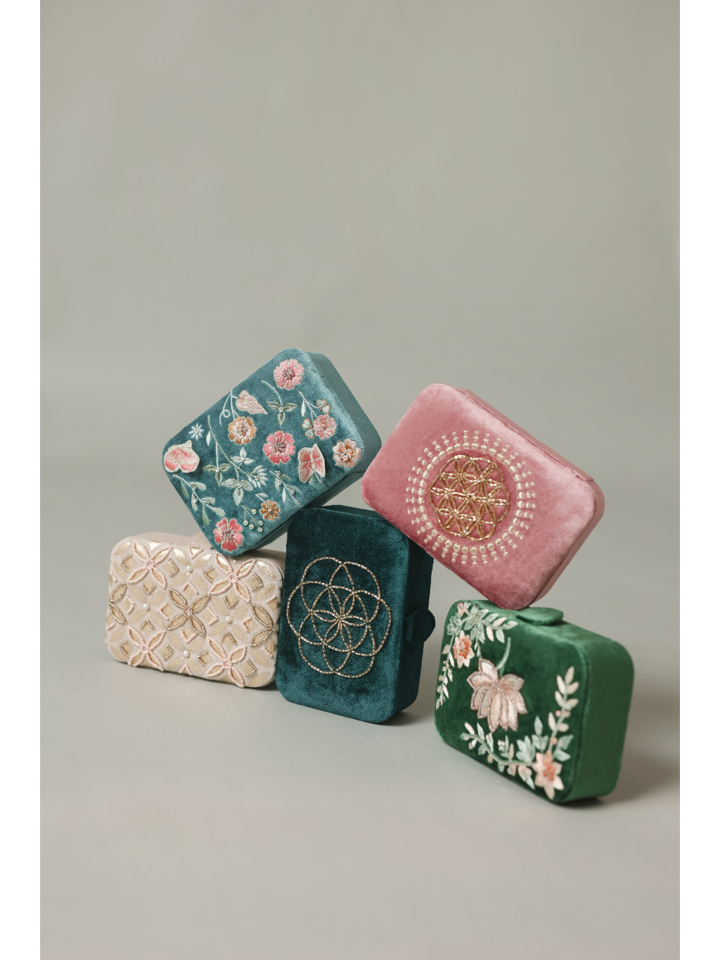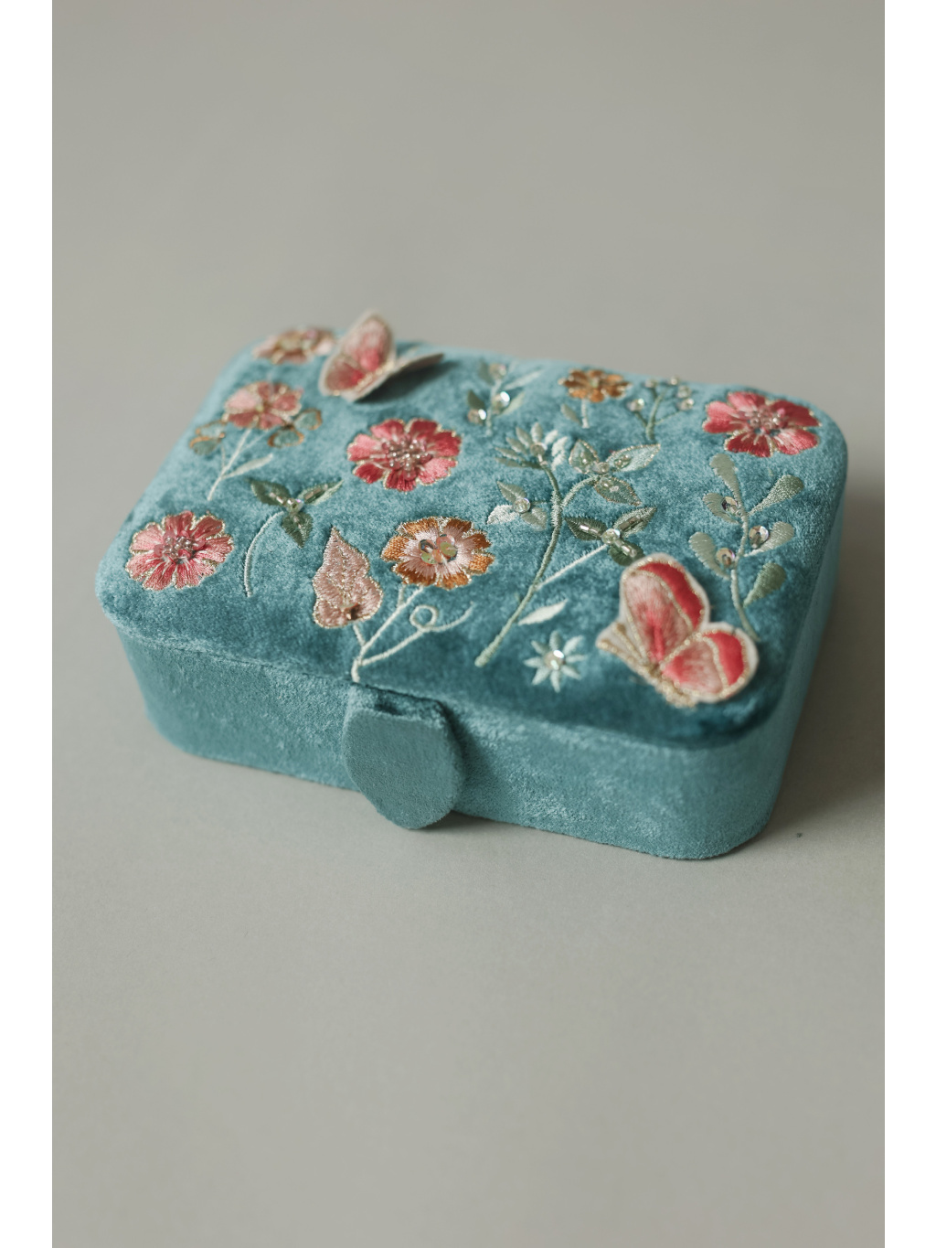 Tato půvabná šperkovnice s motivem květin a motýlů působí jako drobná poetická zahrádka. Je měkce sametová na dotek, pevně drží tvar a je zdobená bohatou výšivkou v jemně růžových a pastelových tónech.