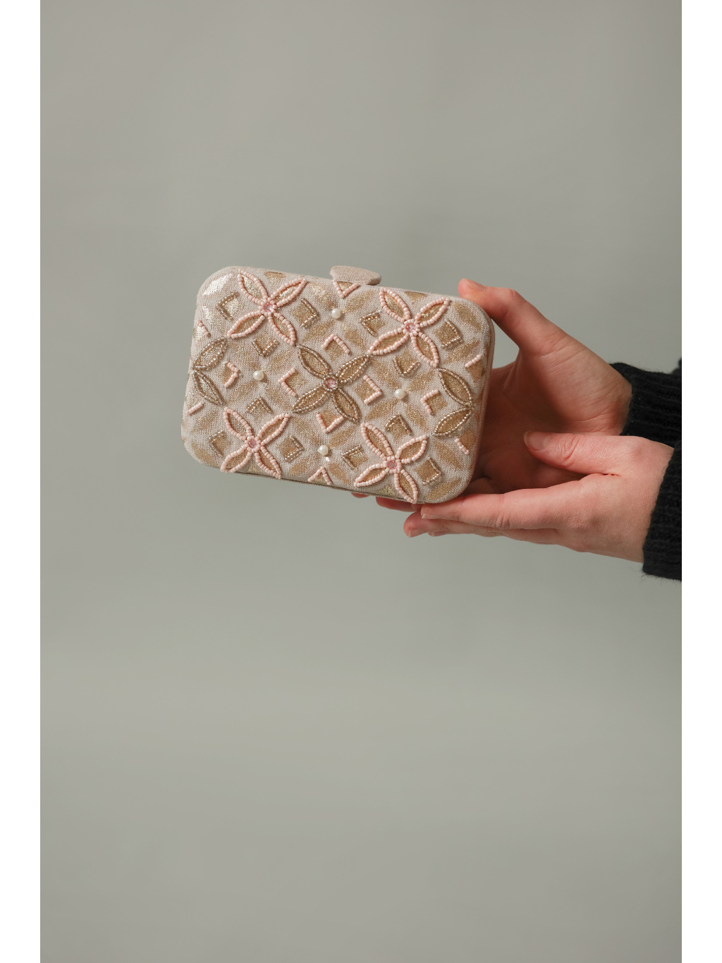 Na dotek hebká, potažená látkou s výšivkou v pudrově růžových a zlatých tónech, doplněná o drobné korálky a perličky, které dodávají celému motivu něžný třpyt.