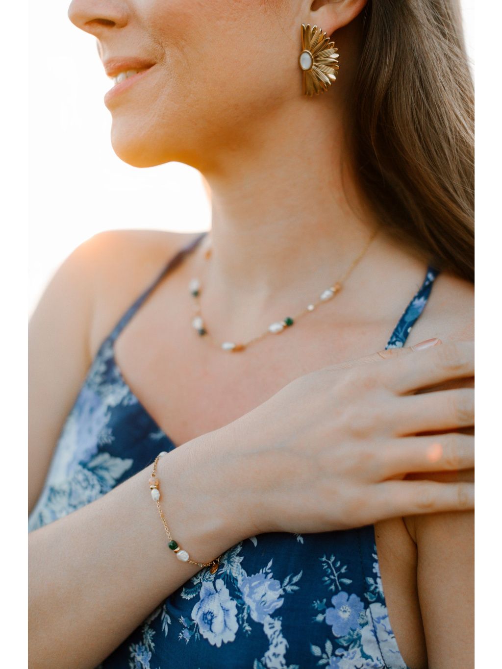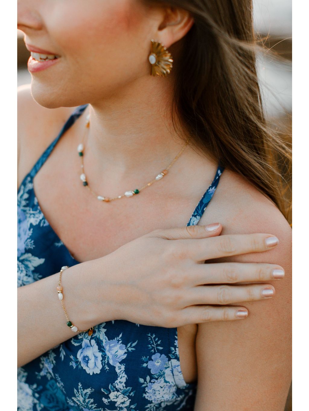 Dovolte tomuto jemnému šperku, aby se stal vaším osobním talismanem, který podtrhne vaši přirozenou krásu při každém pohybu ruky. Kombinace pravých říčních perel a přírodních kamenů na elegantním řetízku přináší do vašeho dne harmonii a nádech francouzského šarmu. 🕊️🌿