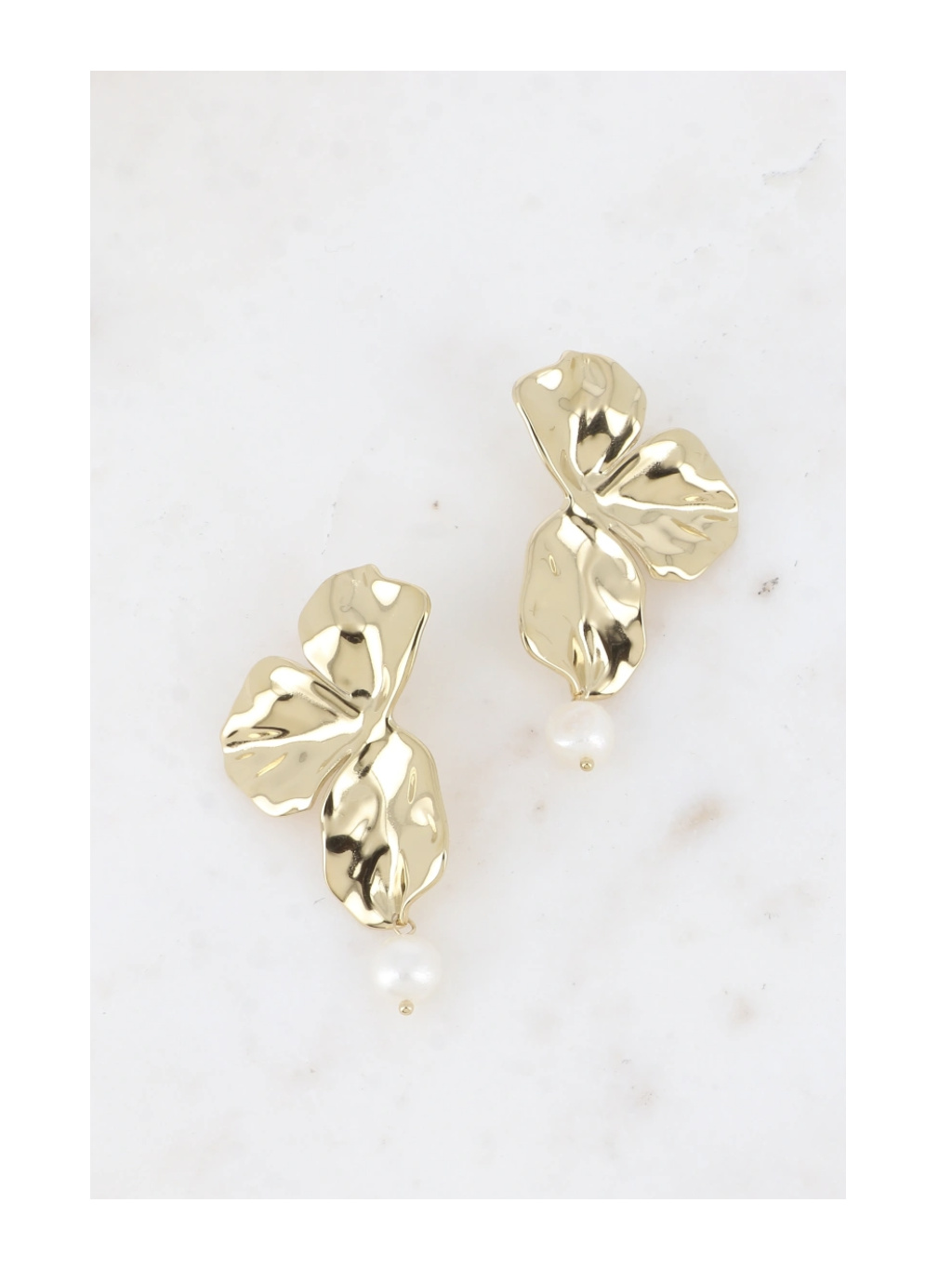 Tři vlnité okvětní lístky tvoří květinový motiv, z jehož středu se s něžností pohupuje sladkovodní kultivovaná perla – každá jedinečná svým tvarem i odstínem, stejně jako ty. 🌸