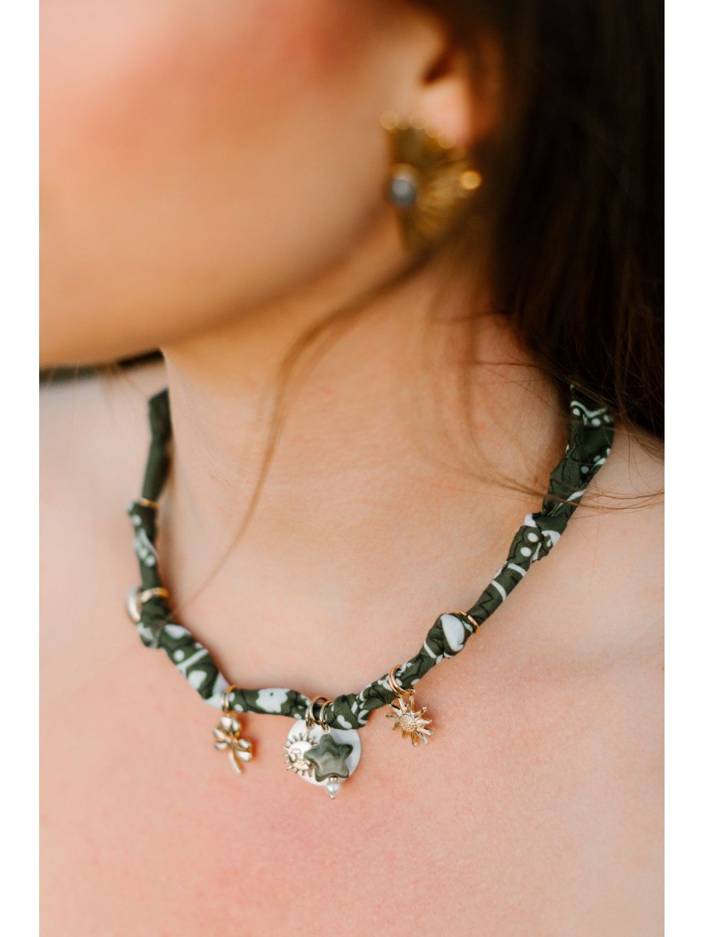 Hledáte šperk, který je stejně jedinečný jako vy? Náhrdelník od pařížské značky BOHM kombinuje hravost barevné tkaniny s pevností nerezové oceli. Základ tvoří proplétaný textilní řetízek s unikátními vzory, na kterém jsou zavěšeny symboly pro radost a harmonii – broušené srdce, čtyřlístek, slunce, květina a detaily z pravé perleti. ✨