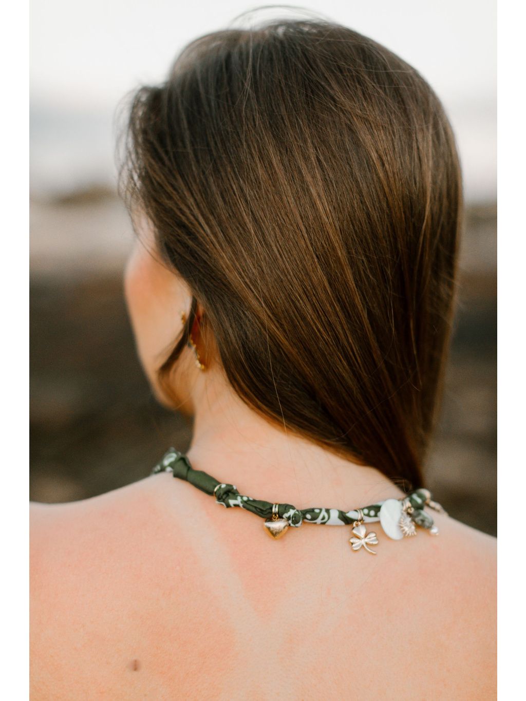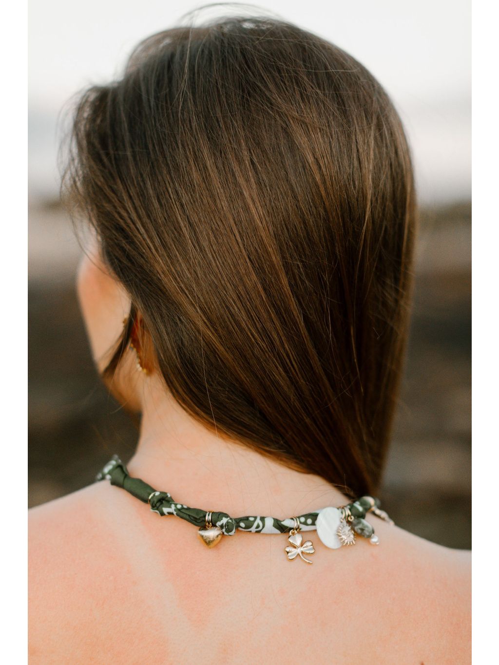 Unikátní spojení barevné tkaniny a nerezové oceli, které vdechne vašemu outfitu život. Tento proplétaný náhrdelník zdobený perletí, broušeným srdíčkem a květy je hravým talismanem pro každý den. ✨ Pařížský šarm v jeho nejbarevnější podobě. 🕊️🌿