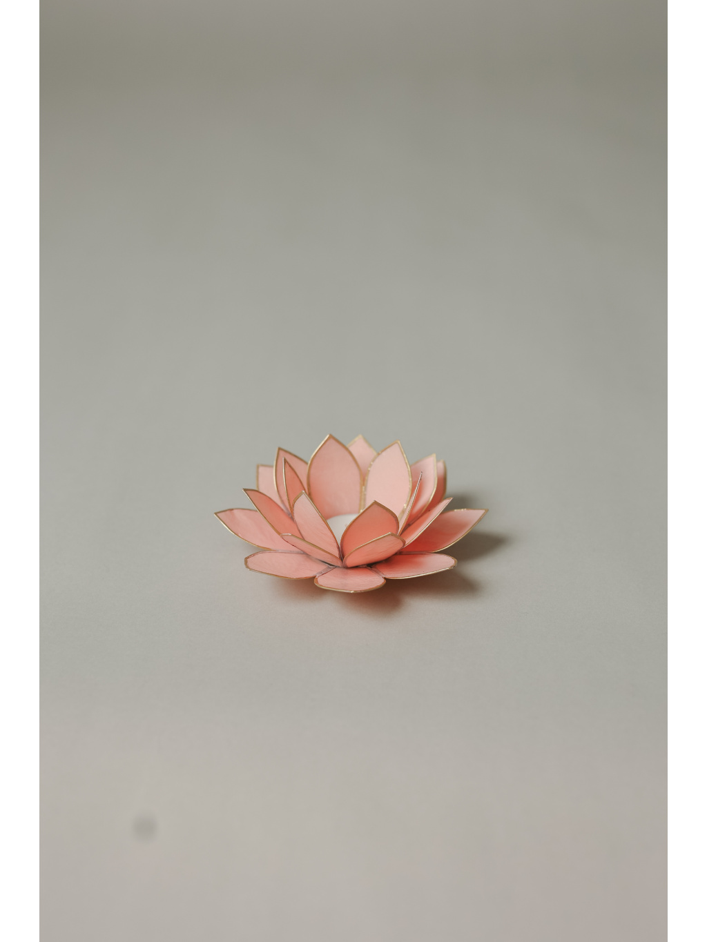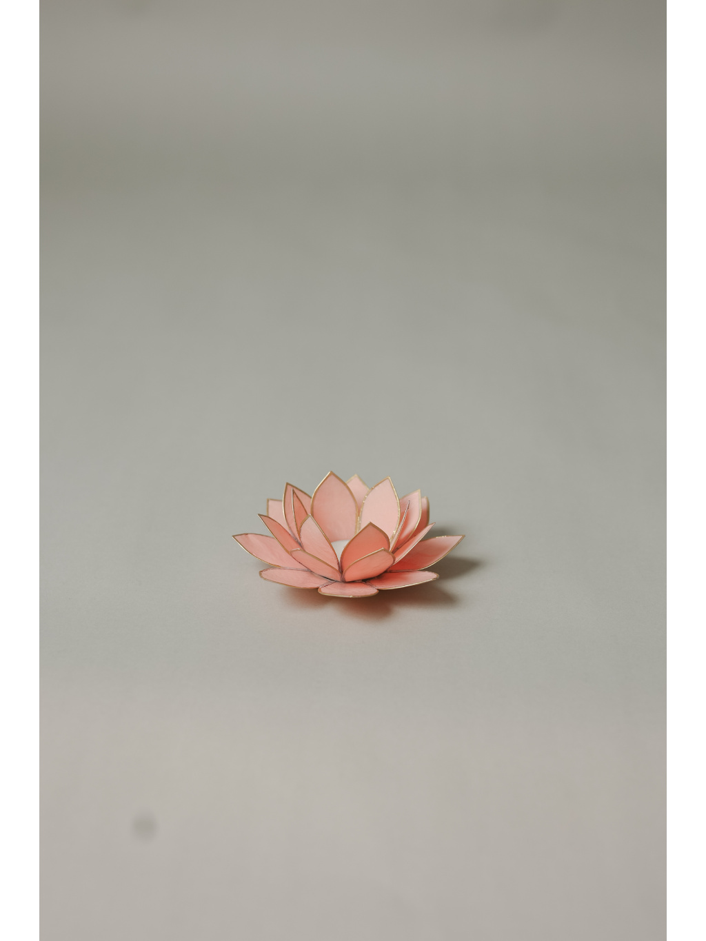 Pastelově růžový svícen ve tvaru lotosu se zlatým lemem. Symbol jemnosti, lásky a vnitřního klidu. Ideální pro večerní rituály i jako dárek. 🕯️🤍